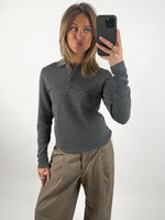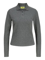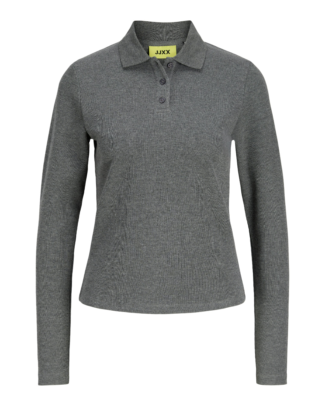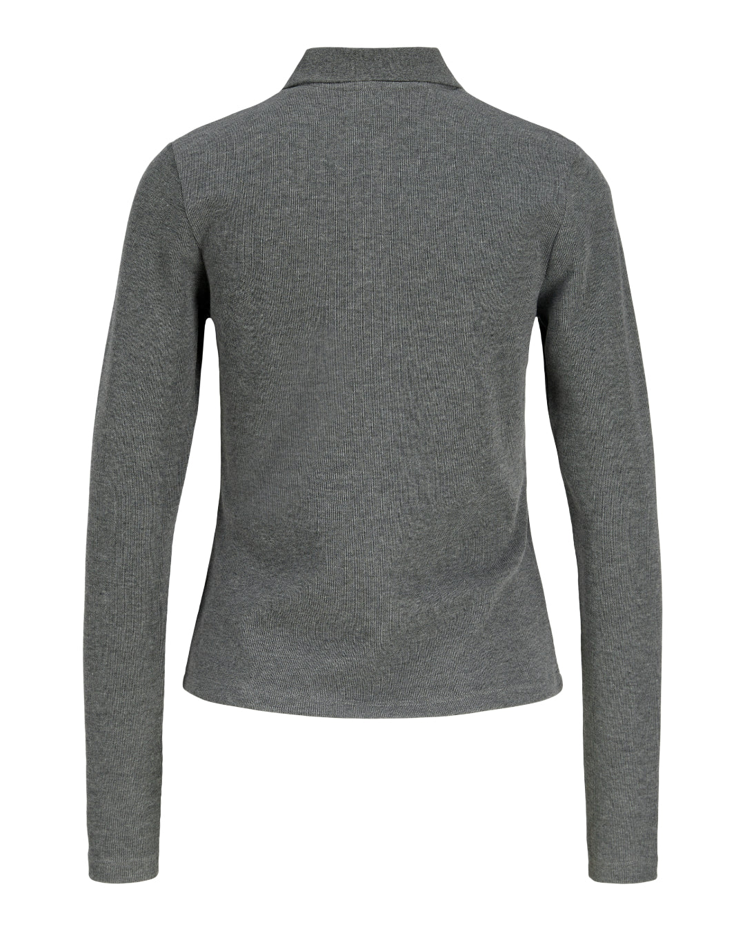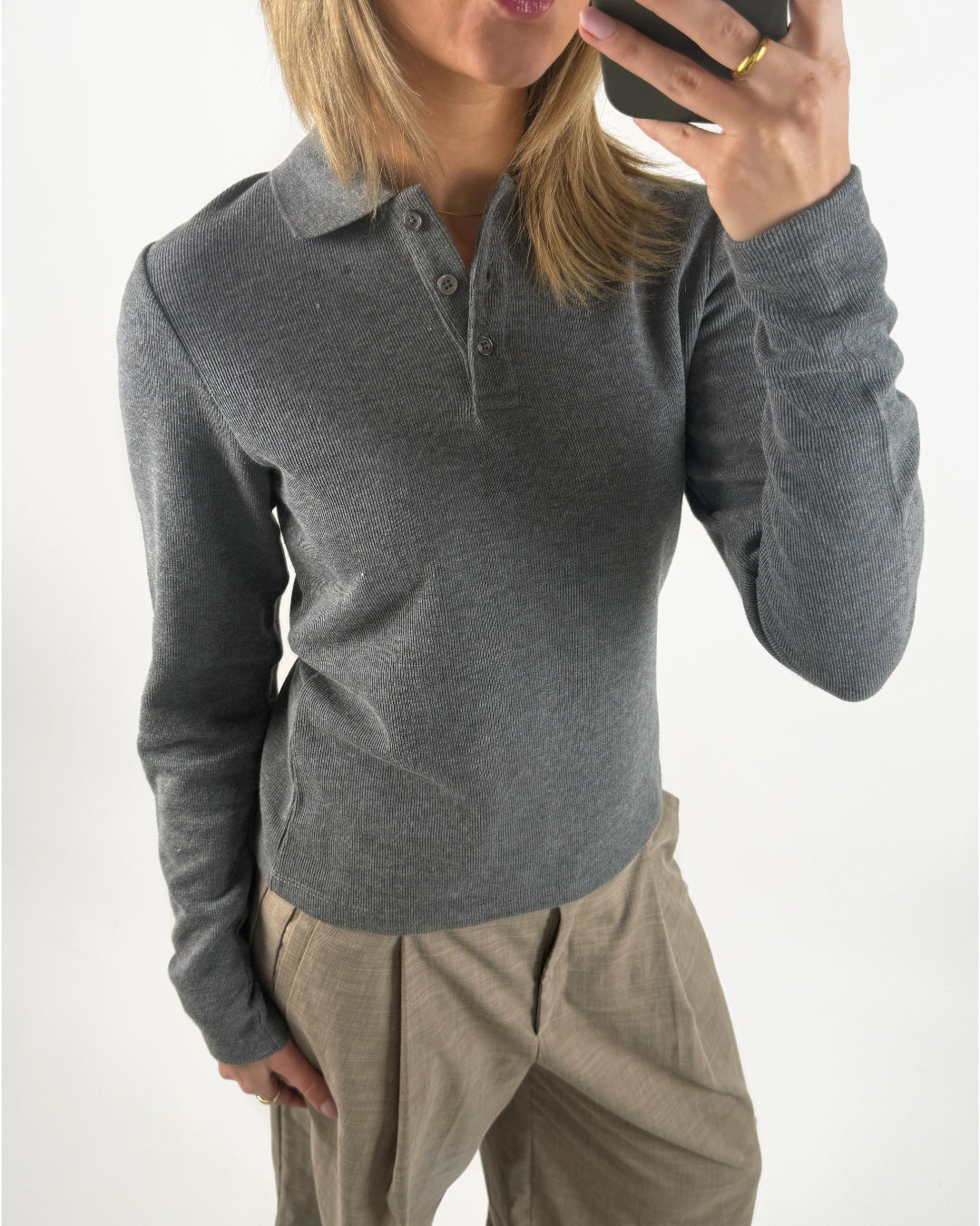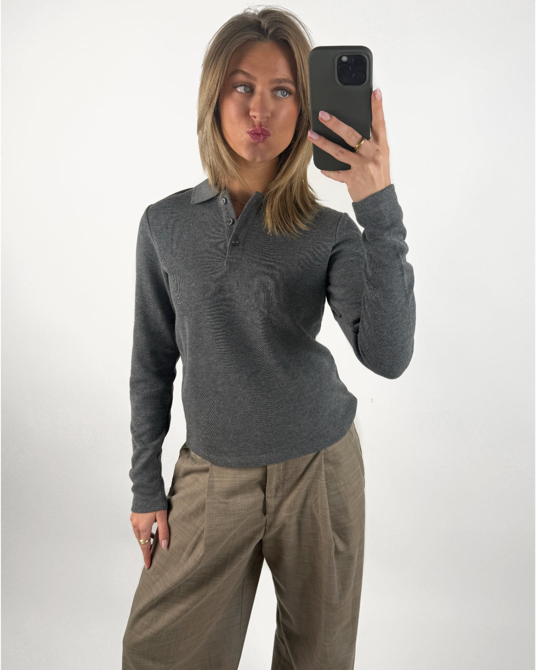 Ge din basgarderob ett lyft med denna härliga långärmade OLIVIA polo blus, grå i rib material. Blusen har den klassiska polo kragen och 3 knappar för stängning på bröstet. Tyget är mycket stretchigt.