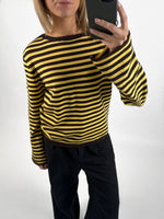 Den fede boxy REBEKKA stribet long sleeve, gul/brun er den perfekte stribede langærmede trøje til garderoben. Trøjen er i et blødt tætstrikket materiale, hvilket gør at den sidder så cool.