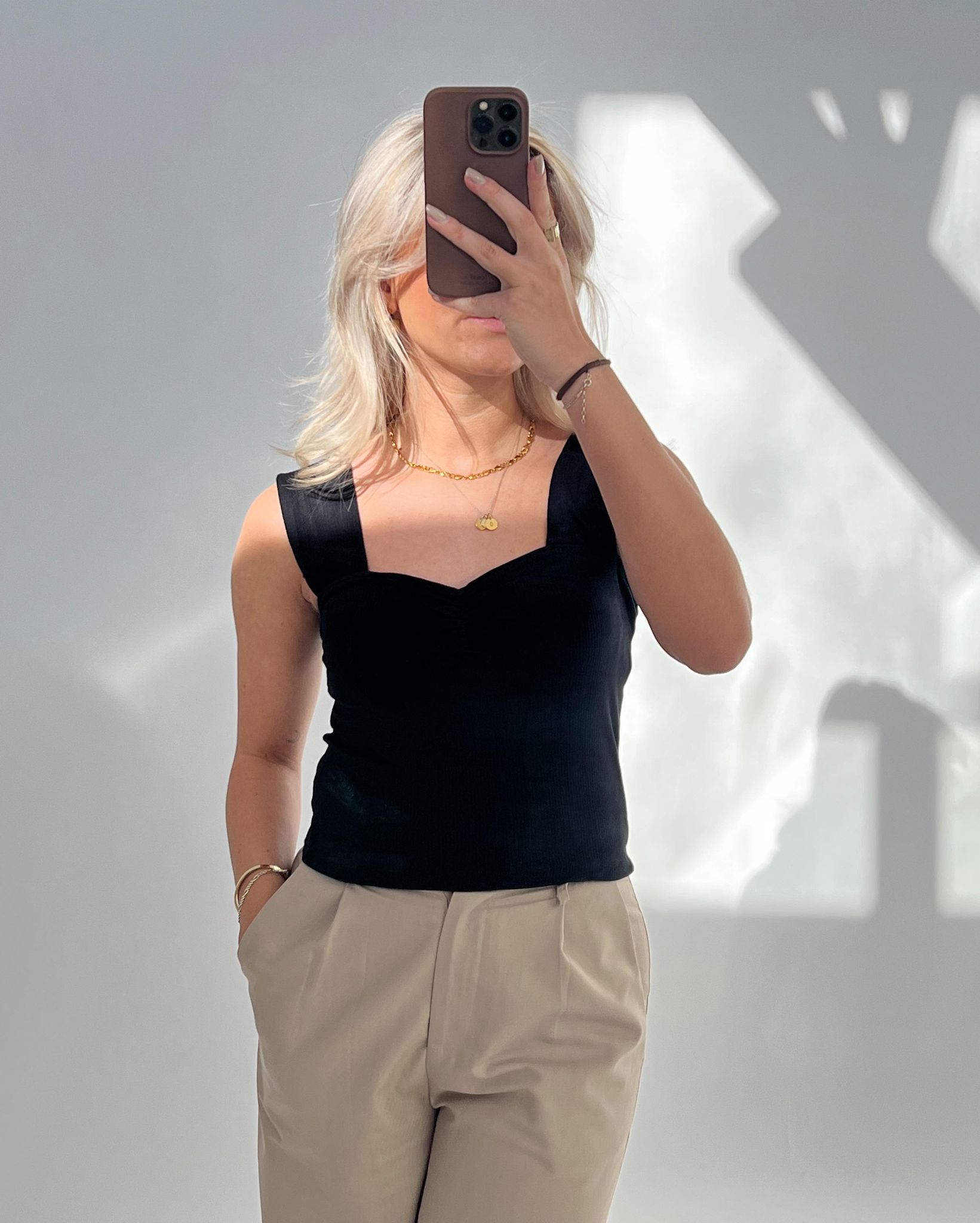 RIE toppen, svart är ett måste i garderoben. Den kan både användas för en varm sommardag, men också för en middag ute, då den kan stylas på många sätt. Toppen är en smula annorlunda än många andra av våra toppar som kan hittas i vår shop, ni kan se mer av dem här - TOPPAR.