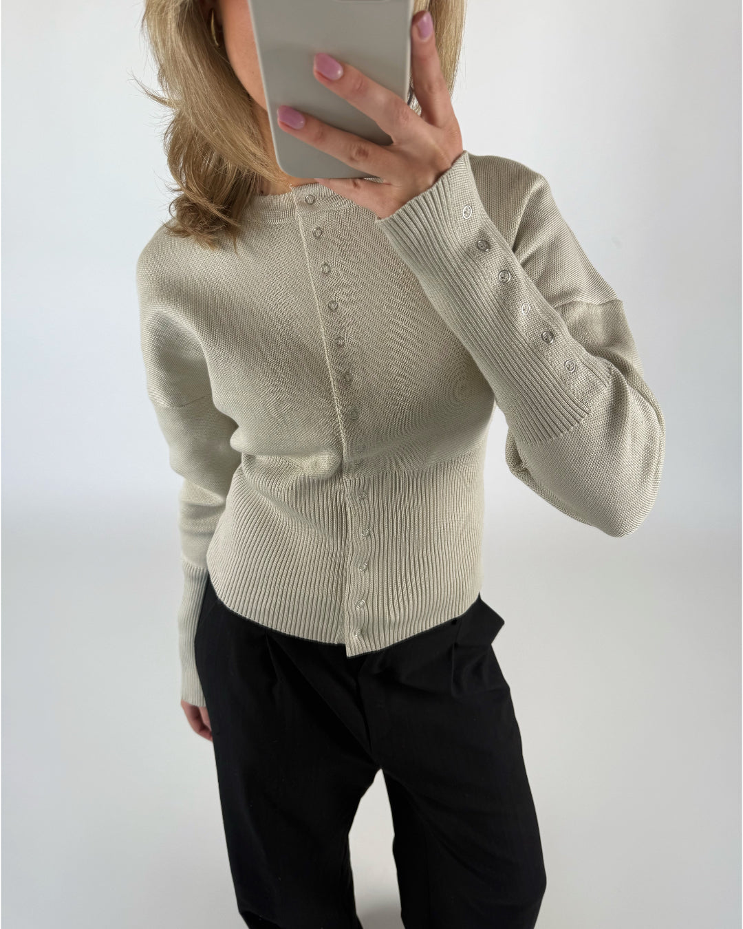 Den vackra RORY tröjan, beige sitter helt enkelt SÅ vackert på kroppen. Tröjan har långa ärmar, tajt sittande rund hals och så går den in i stycket vid midjan.