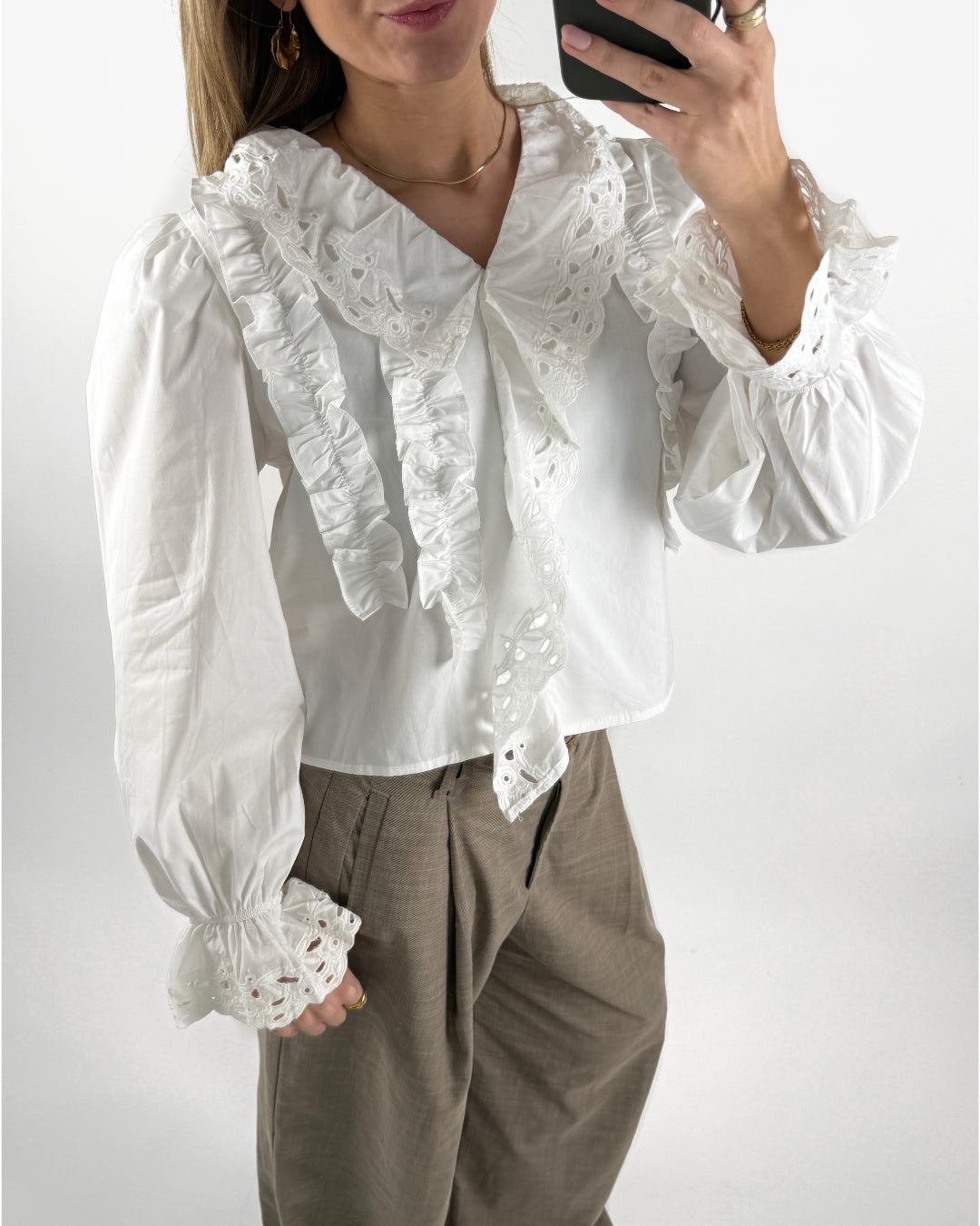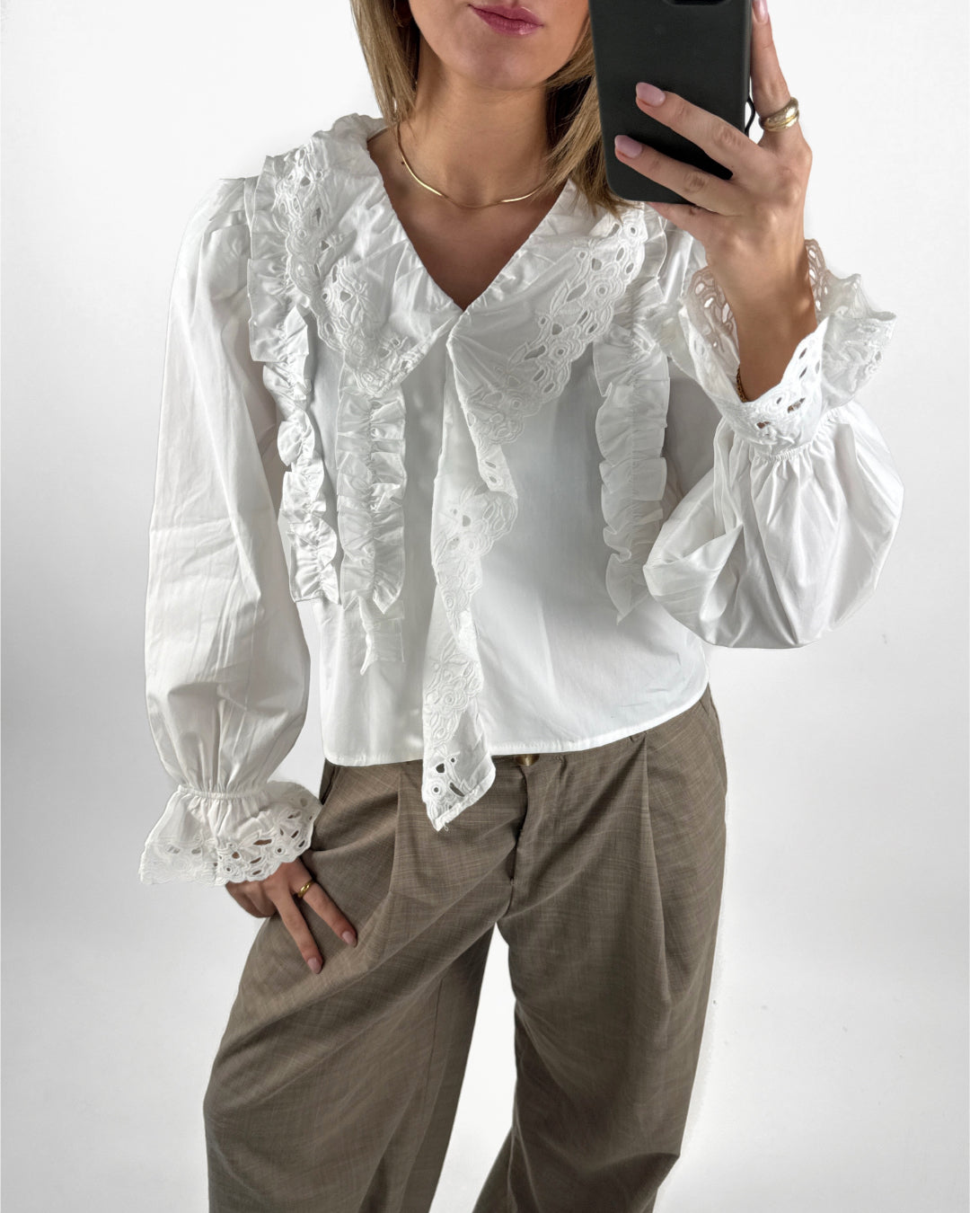 De långa ärmarna avslutas med elastik och vackra insnörningar, vilket ger en lätt puff och en smickrande passform. Den luftiga kvaliteten gör blusen bekväm att bära och perfekt både för vardag och festliga tillfällen. En tidlös klassiker som enkelt kan stylas upp eller ner.