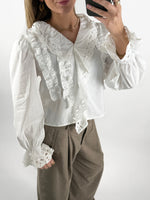 SALEM volangblus, vit har knappar fram som stängning, dolda bakom volangen.