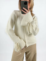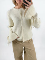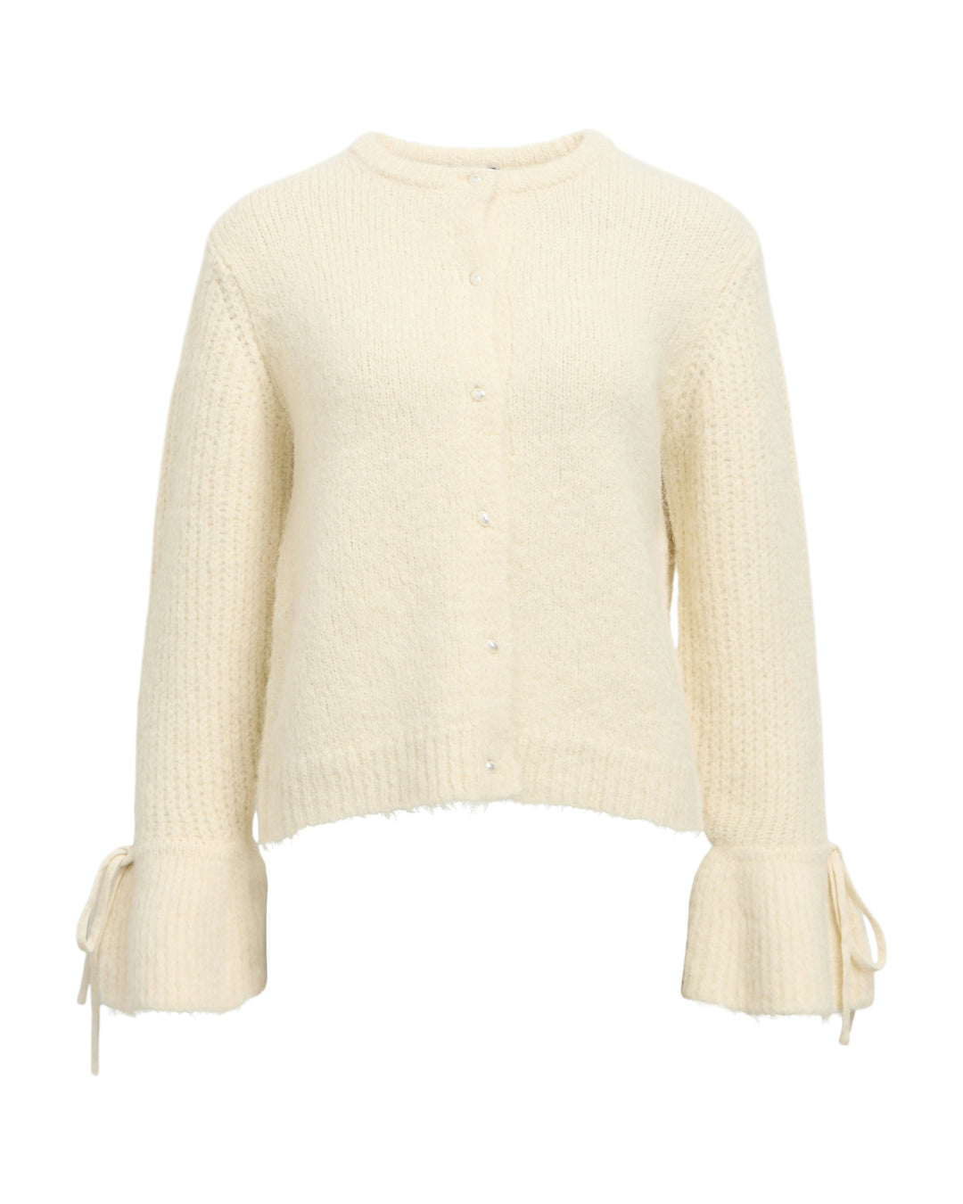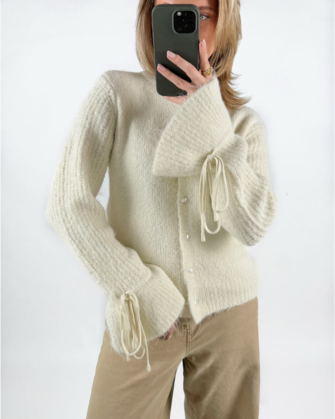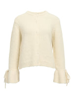 Den vackra SALIKA stickade cardigan, creme är en verkligen elegant cardigan med knapplåsning och vackra detaljerade ärmar.