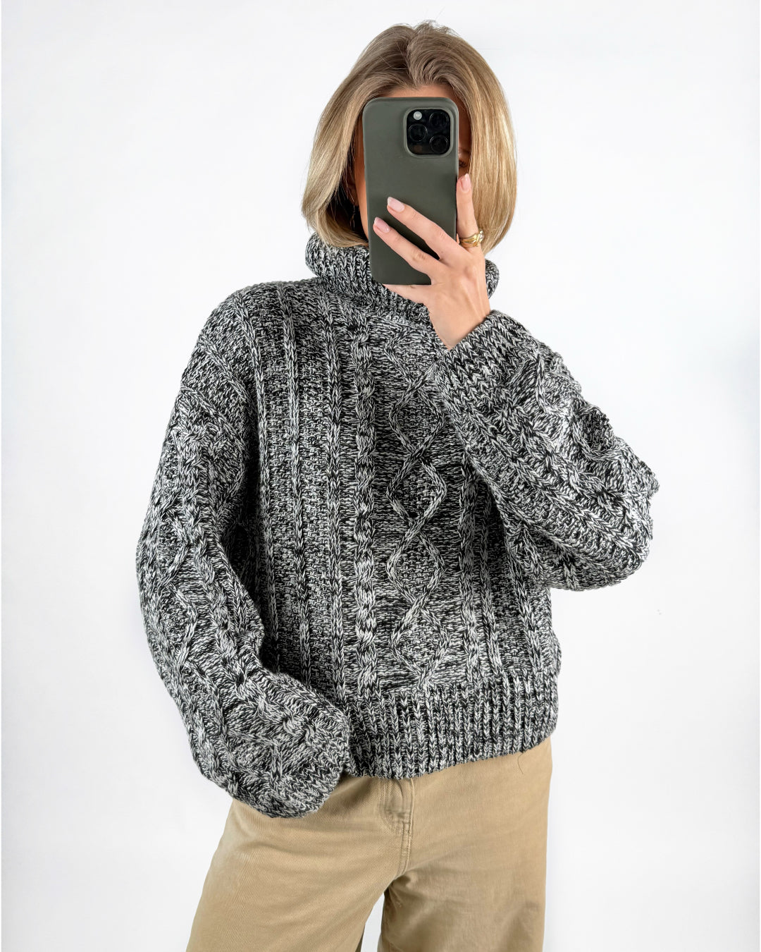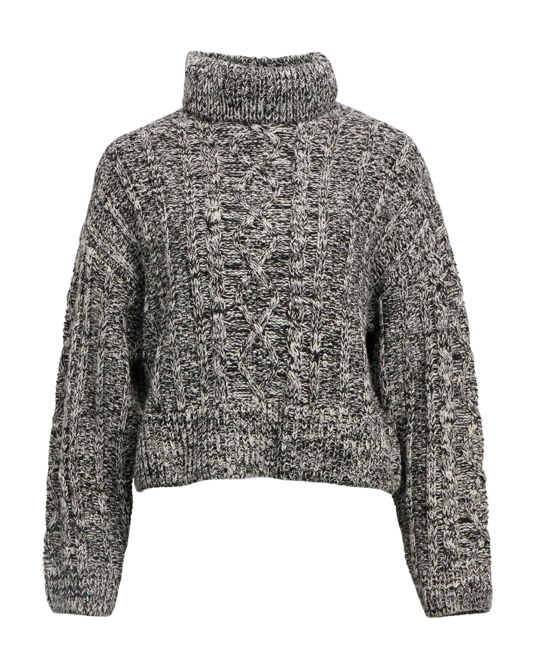 SIMIK rullkrage sticka, svart/vit är en perfekt basic att ha i garderoben. Den är en läcker och chunky kabelsticka och med rullkrage. Sticktröjan är långärmad, och i ett stretchigt material.