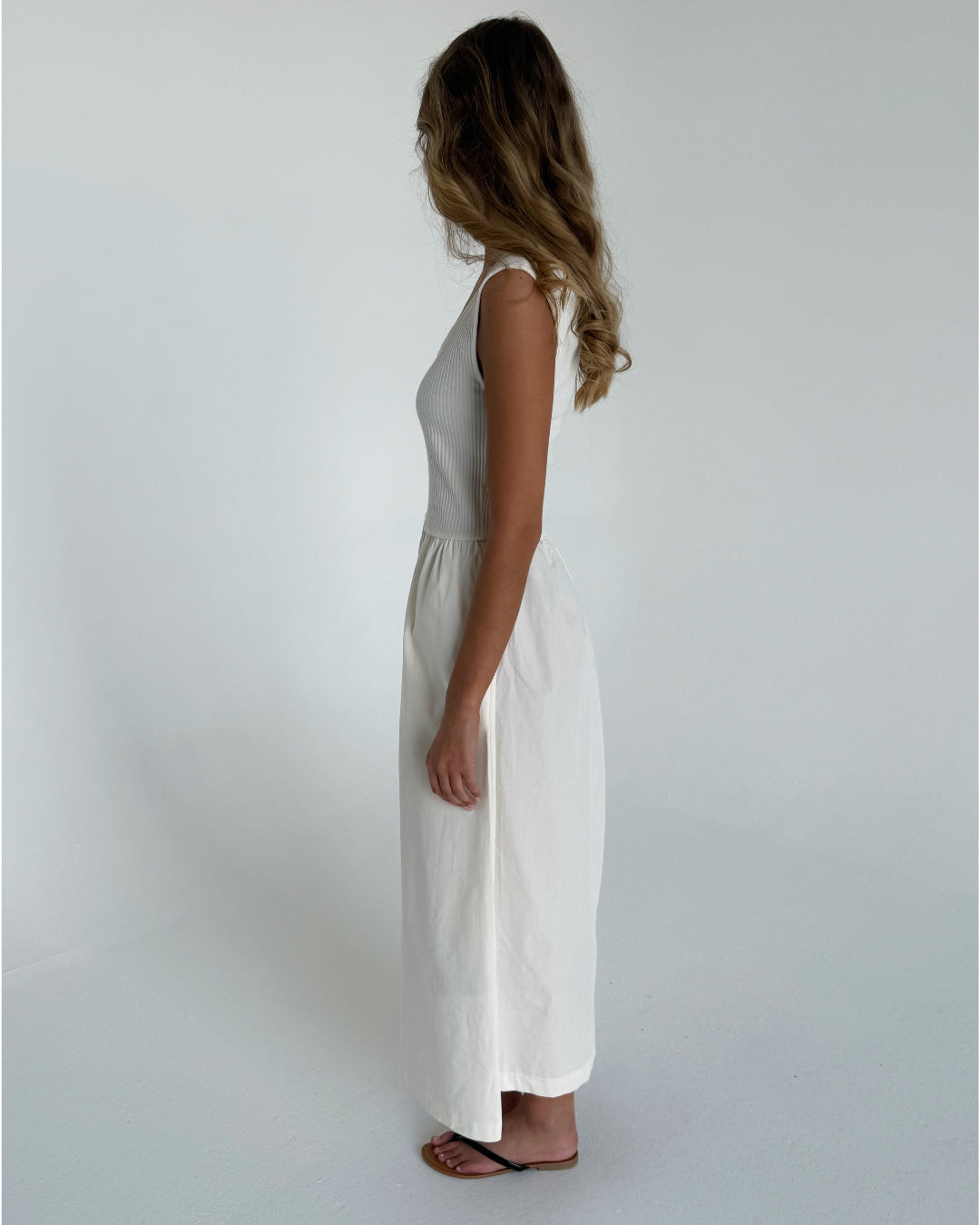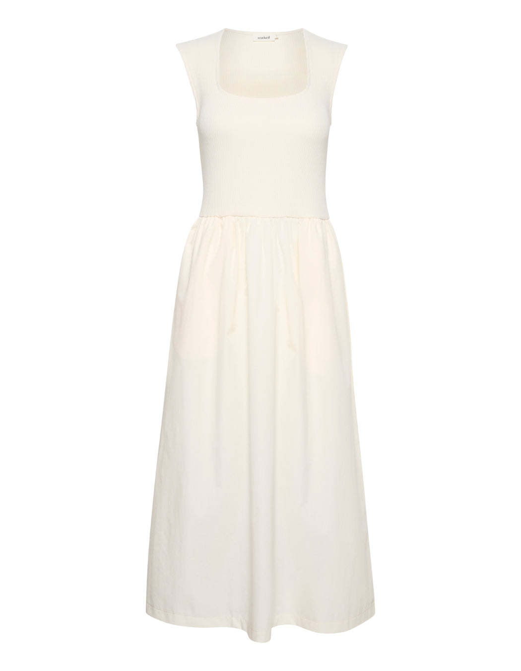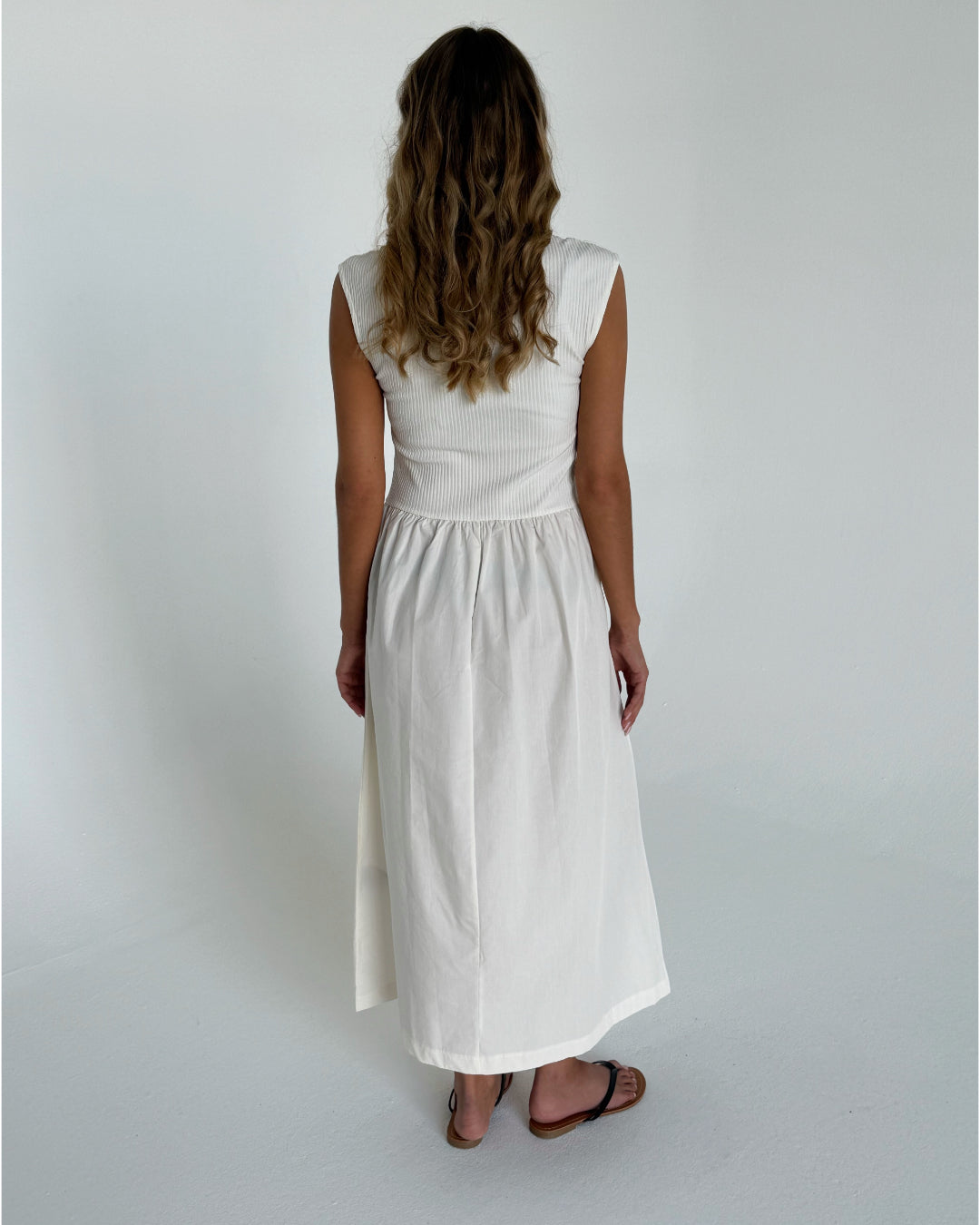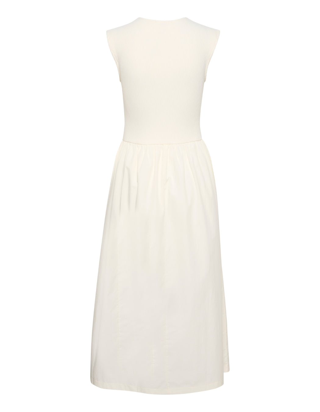 Ærmeløs kjole i hvid, med ribbet overdel og løst faldende skørt. Set bagfra, hænger afslappet i et lyst studie uden yderligere dekorationer.