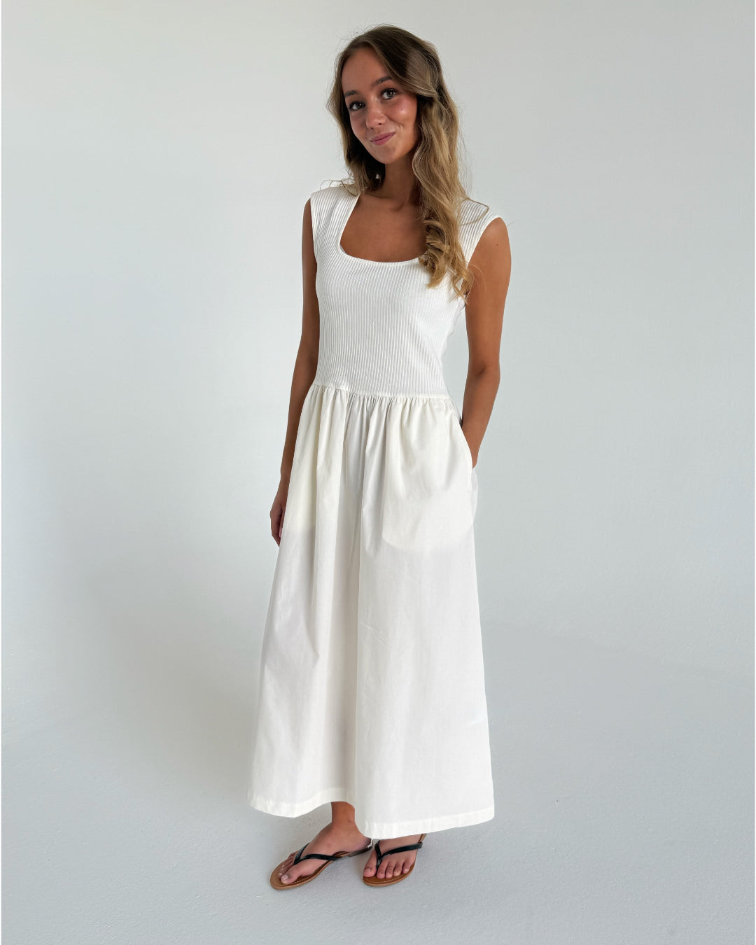 En kvinde iført en lang, hvid kjole står afslappet med hænderne i lommerne i et minimalistisk, lyst rum. Hun bærer sorte sandaler.