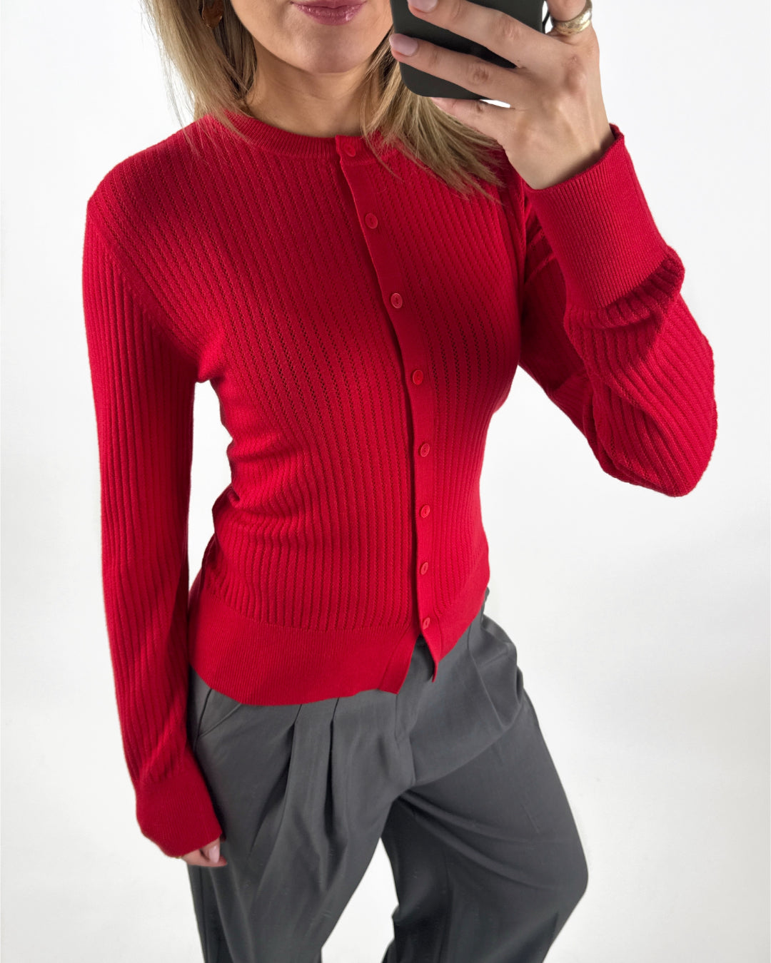 Den klassiska SPINA långärmad cardigan, röd är med knapplåsning hela vägen ner längs framsidan. Cardiganen har en enkel och tidlös design med rund hals och fin struktur i tyget, som ger ett elegant och lätt uttryck.