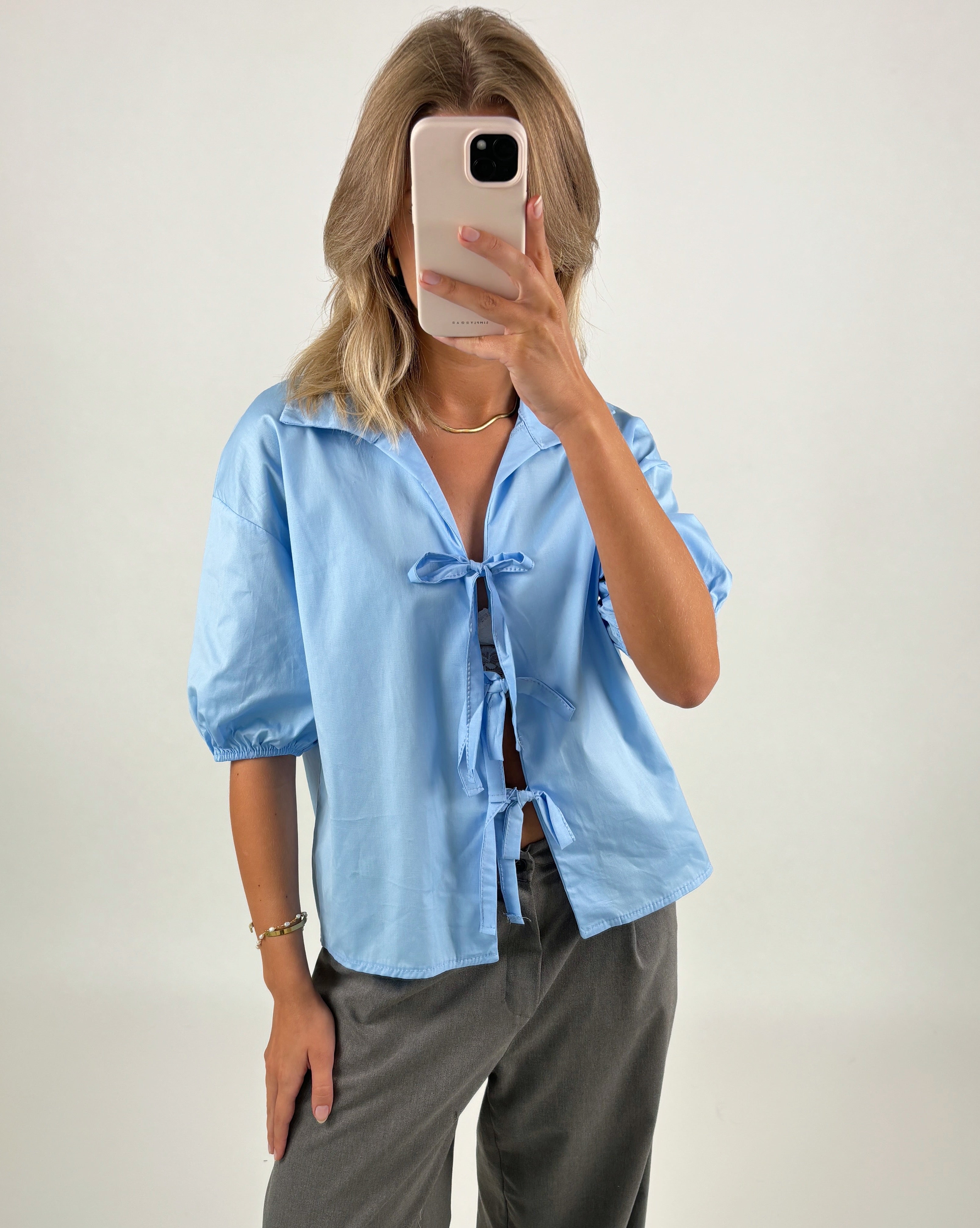 TINKE blus, blå är en elegant skjorta som passar till alla tillfällen. Skjortan stängs med hjälp av bindebandet fram, som kan knytas till 3 söta rosetter.