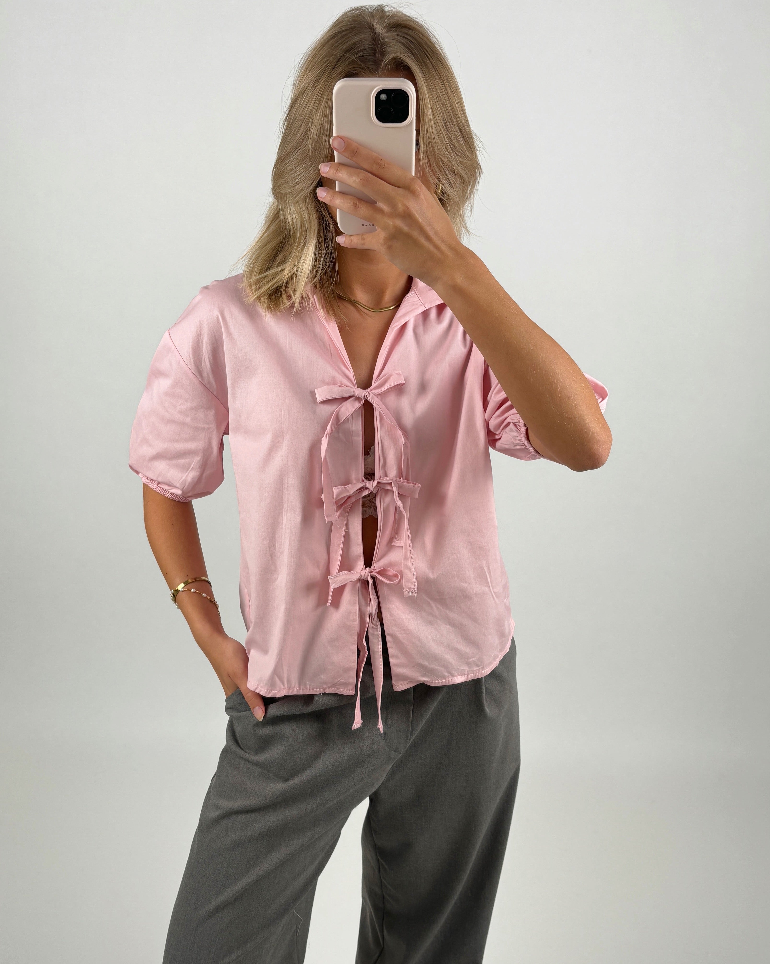 TINKE blus, ljusrosa är en elegant skjorta som passar till alla tillfällen. Skjortan stängs med hjälp av bindebandet fram, som kan knytas till 3 söta rosetter.
