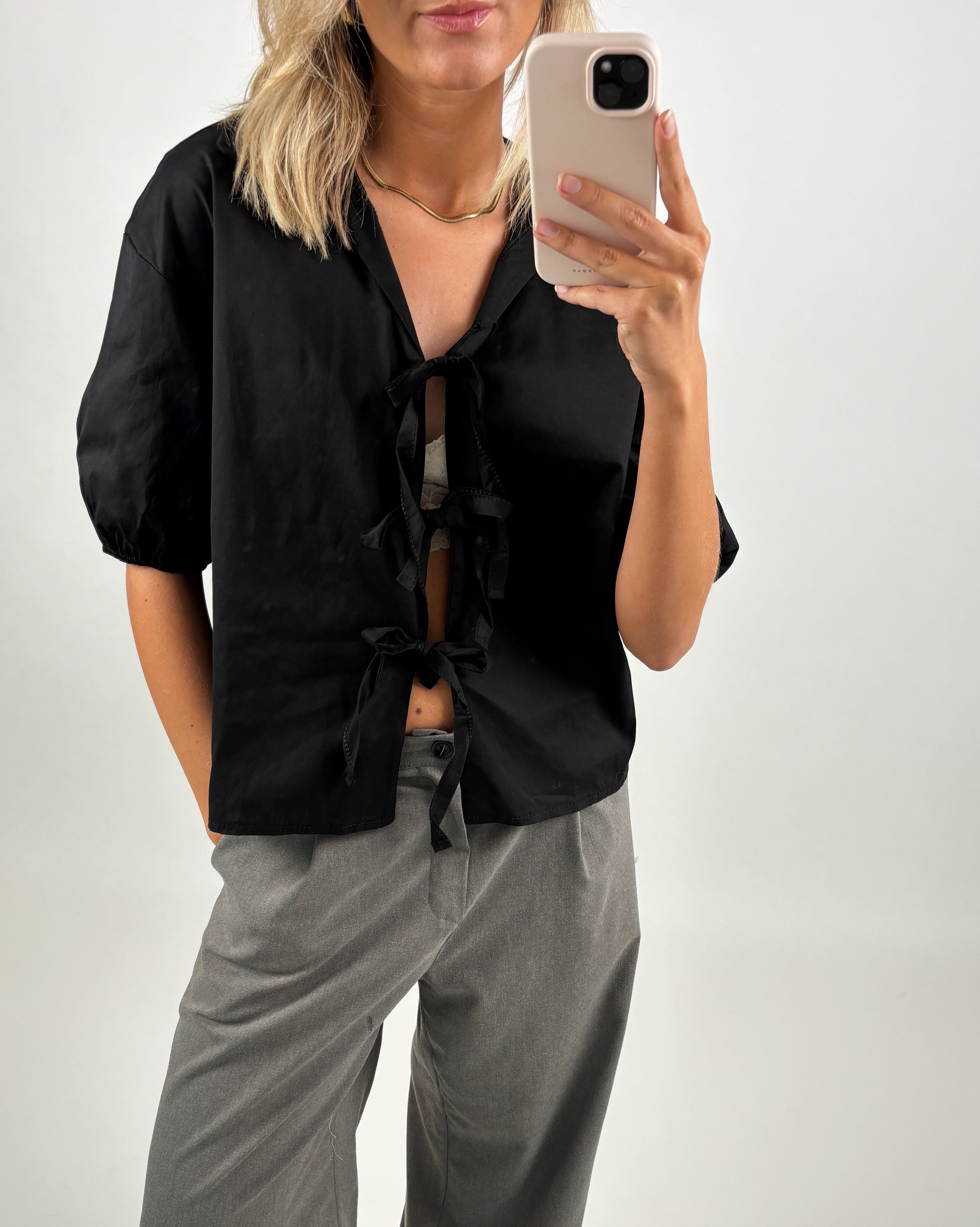 TINKE blus, svart är en elegant skjorta som passar till alla tillfällen. Skjortan stängs med hjälp av bindebandet fram, som kan knytas till 3 söta rosetter.