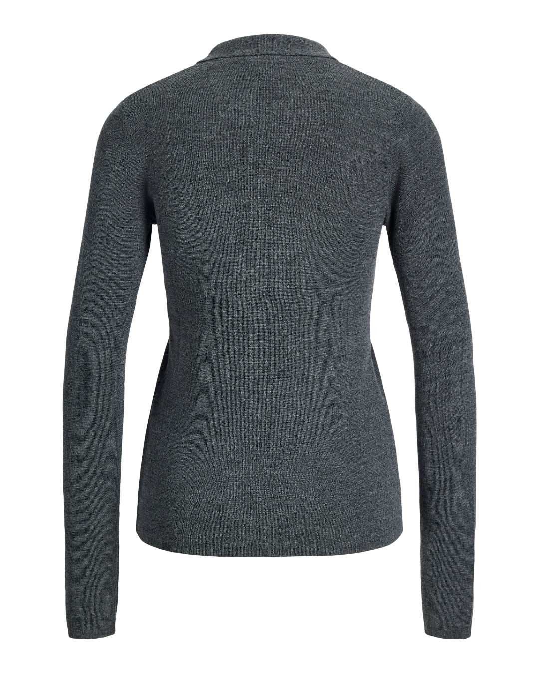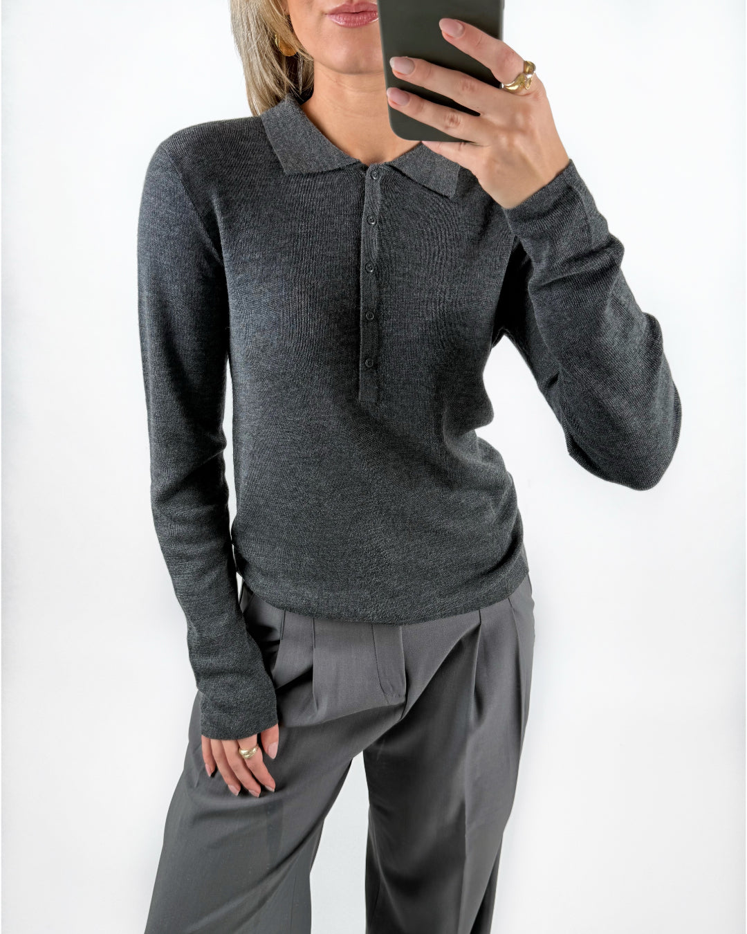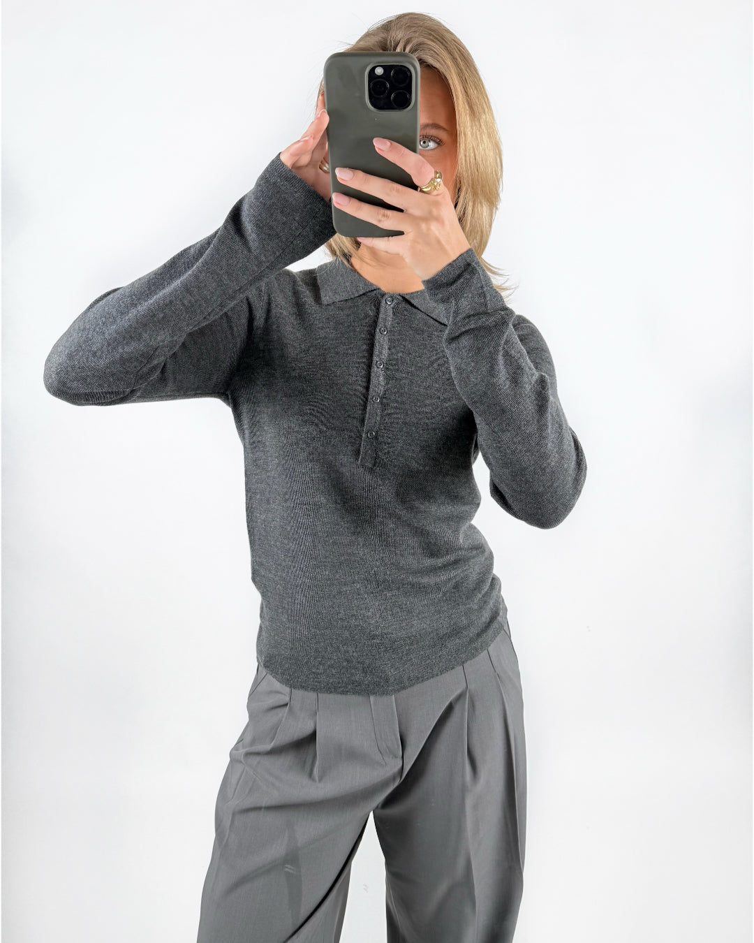 Vår WREN polo sticka, grå är en långärmad slätstickad tunn polo, som har krage och 5 knappar för stängning på bröstet.