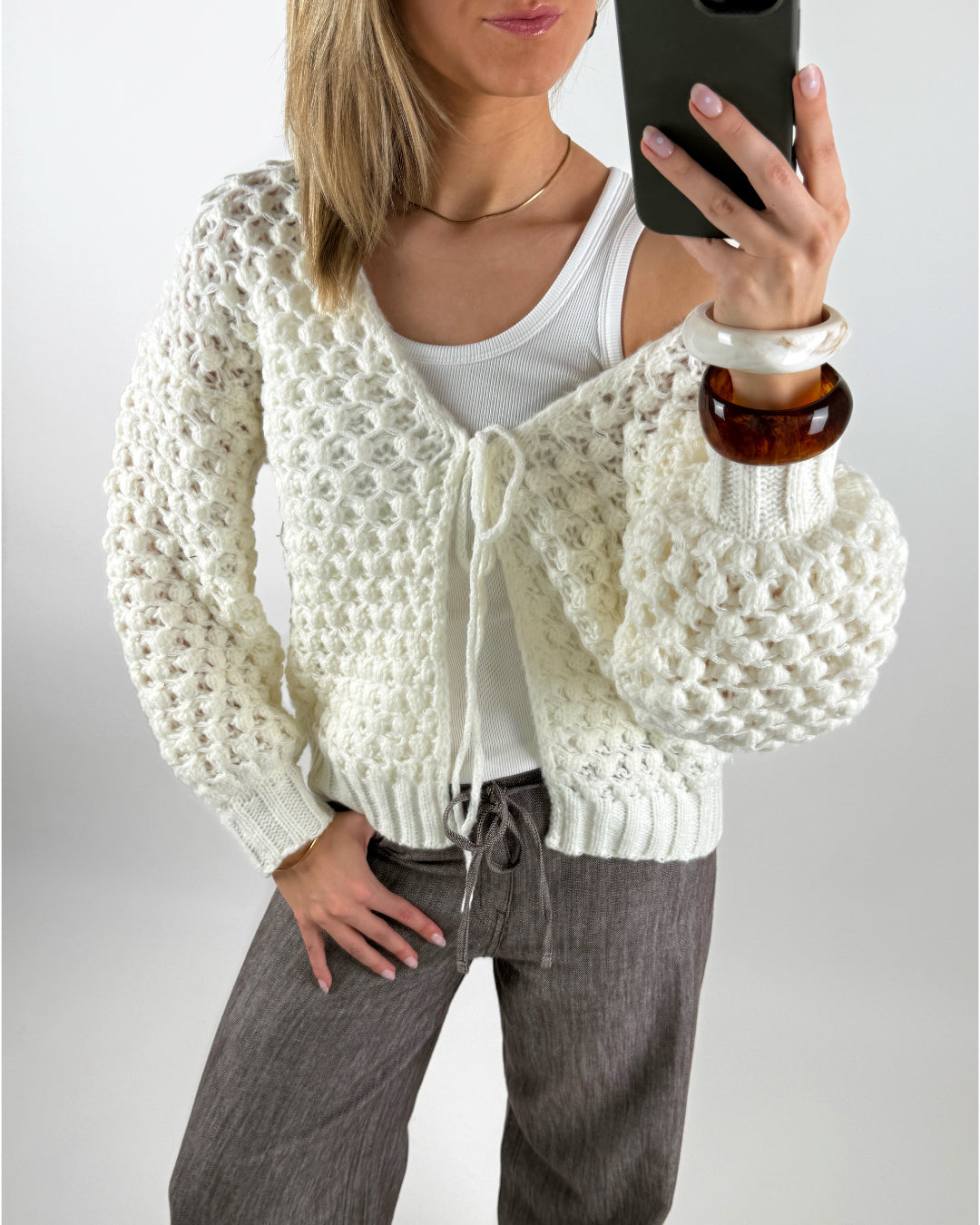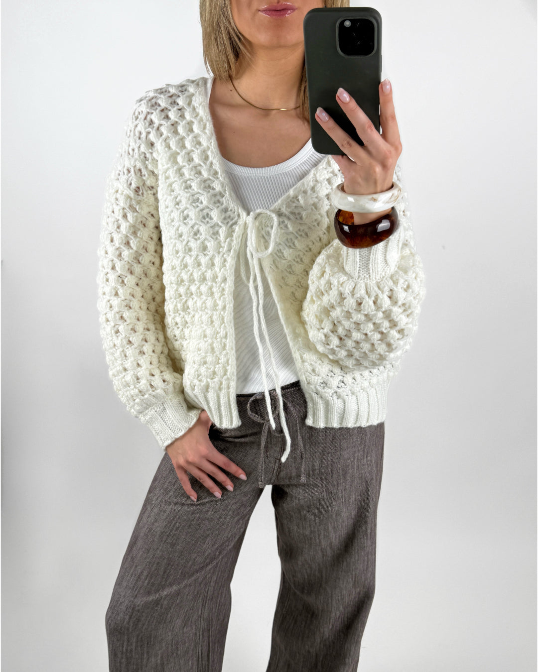 Modellen har långa puffärmar, breda ribbkanter samt ett bindeband fram, så att du enkelt kan anpassa passformen och skapa den perfekta silhuetten. Den mjuka och varma kvaliteten gör tröjan idealisk för både kalla dagar eller som ett lätt lager inomhus. Cardiganen kan stylas över en enkel topp och jeans för en avslappnad och trendig outfit.