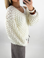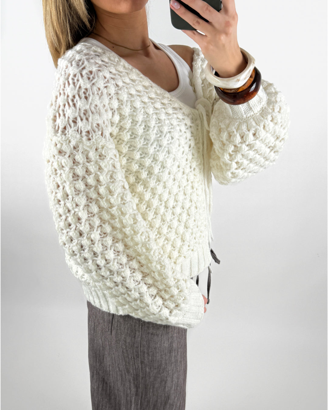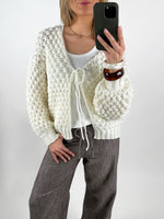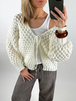Denna ZOE sticka cardigan, vit är det perfekta valet för dig som önskar en feminin och mysig look. Cardiganen är stickad med ett fint, strukturerat bubbelmönster som ger ett exklusivt och handgjort uttryck.